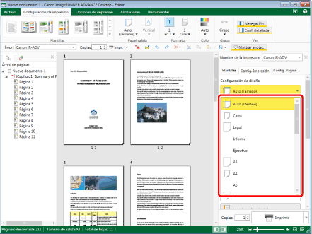 Si se ha seleccionado [Auto (Tamaño)] como el ajuste de tamaño del papel de salida, se seleccionan automáticamente los tamaños del papel de salida para cada página en función de los tamaños de cada página del original.