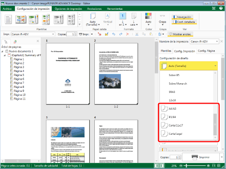 Para imprimir tras haber combinado distintos tamaños de papel, es necesario seleccionar una impresora que admita esta función.