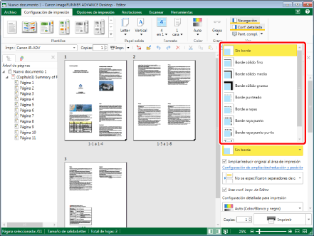Si ha seleccionado algo diferente a [1 en 1] para el diseño de la página, podrá seleccionar los límites en la lista desplegable.