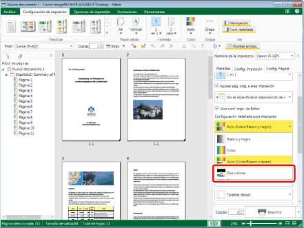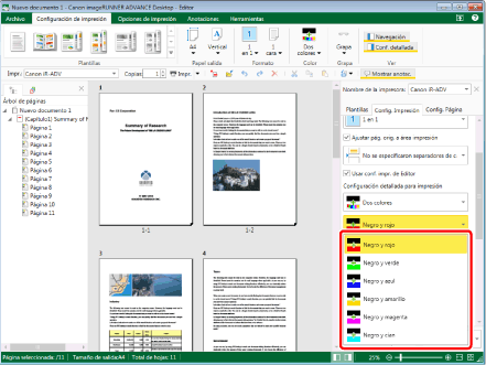 Si se ha seleccionado el modo de dos colores, no puede especificar los ajustes del modo de color para capítulos o páginas específicas.