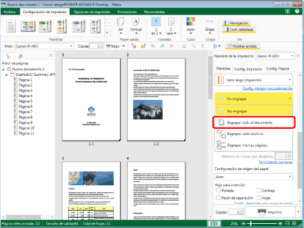 Si no desea utilizar grapado, seleccione [No engrapar] en la pestaña [Config. Impresión] de la Ventana Detalles, el comando de la cinta o el botón de herramienta.