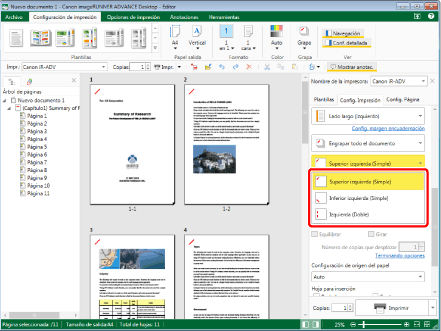 Los ajustes que se pueden seleccionar para la posición de Eco Stapler (sin grapas) varían según el tipo de impresora seleccionada en [Impr.], el tamaño/orientación del papel de salida y la posición de encuadernación.