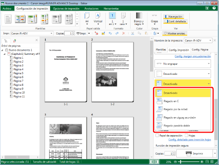 Las opciones de plegado varían en función de la impresora seleccionada en [Impr.].