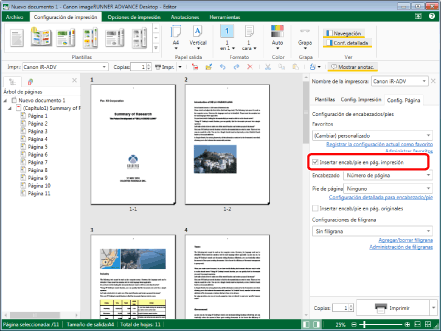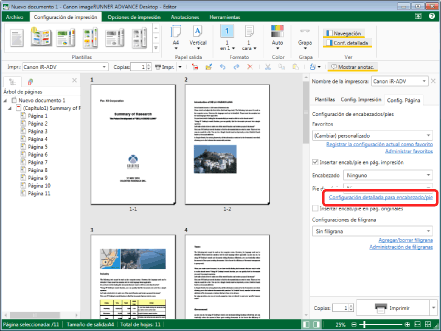 Haga clic en [Aplicar] para revisar la vista preliminar del documento en la Ventana de trabajo sin cerrar la [Configuración detallada de encabezados/pies (páginas de impresión)]/[Configuración detallada de encabezados/pies (páginas originales)].