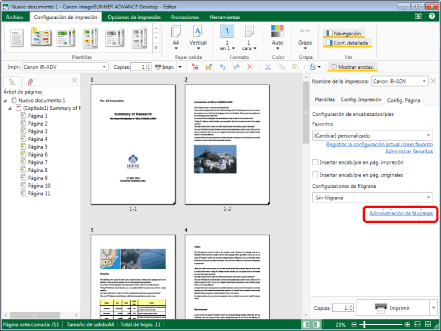 [Administración de filigranas] se mostrará al hacer clic en [Administración de filigranas] en la pestaña [Config. Página] de la Ventana Detalles.