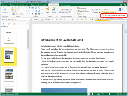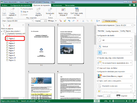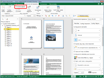 Si seleccionó un capítulo como posición para insertar la página nueva, la página nueva se añade como primera página del capítulo, con el mismo tamaño / la misma orientación de papel que la primera página del capítulo seleccionado. Si no hay páginas en el capítulo seleccionado, se añade una página nueva con un tamaño / orientación de papel que se corresponde con los ajustes de tamaño/orientación de papel establecidos para el capítulo seleccionado.