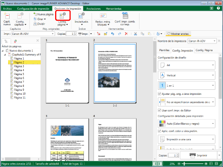 Esta función solo se puede utilizar si selecciona una impresora Canon y la casilla [Usar conf. impr. de Editor] en la pestaña [Config. Impresión] de la Ventana Detalles, el comando de la cinta o el botón de herramienta.