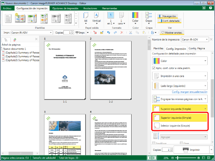 Esta función solo se puede utilizar si selecciona una impresora Canon y la casilla [Usar conf. impr. de Editor] en la pestaña [Config. Impresión] de la Ventana Detalles, el comando de la cinta o el botón de herramienta.