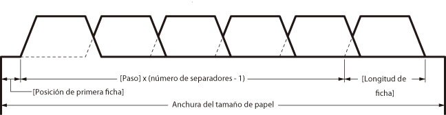 Confirme que no se supera el tamaño de papel basándose en los valores especificados en [Posición de primera ficha], [Longitud de ficha], y [Paso]. Si se muestra un mensaje de error al hacer clic en [Aceptar] después de especificar los valores, ajuste los siguientes valores para que el total sea inferior a la altura del tamaño de papel establecido en [Tamaño de salida].