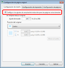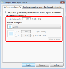 [Aunque Ajuste de escala] esté al 100 %, no significa que se esté conservando el tamaño original. En cambio, se aumentará o reducirá el tamaño de las páginas originales para que se ajuste al área de impresión según las opciones configuradas para cada capítulo o para el documento completo. Teniendo en cuenta esto, configure los valores numéricos por páginas.