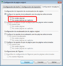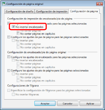 Para cancelar la configuración de pie de página para la página de impresión, seleccione las casillas de verificación [Configure los ajustes de pie de página para las páginas seleccionadas] y [No insertar pies].