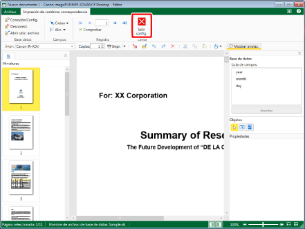 Al abrir un documento IWB en el que se encuentra almacenada la información de conexión a una base de datos, el inicio del Modo de ajuste de impresión de Combinación de correspondencia hace que la base de datos se conecte de forma automática y que se actualicen los datos de Combinación de correspondencia.