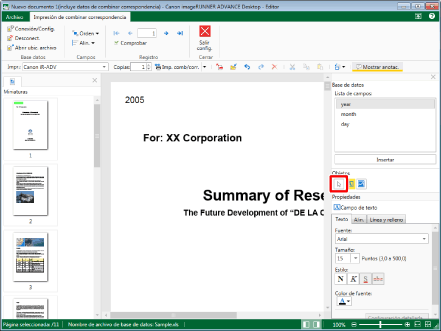 Los ajustes detallados de un campo de Combinación de correspondencia solo se pueden configurar cuando se ha seleccionado un único campo de Combinación de correspondencia.
