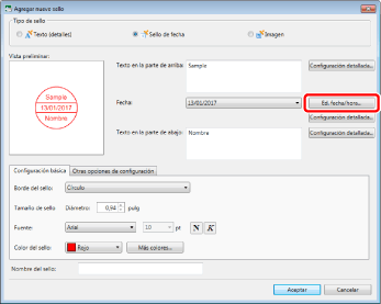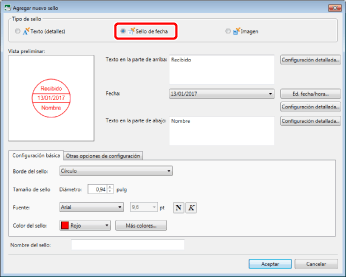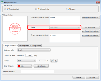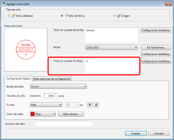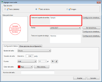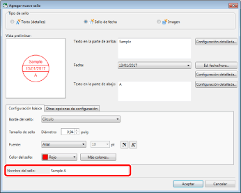 Si no introduce un nombre en [Nombre del sello], se establecerá automáticamente un nombre extraído del texto introducido en [Texto en la parte de arriba]/[Texto en la parte de abajo].