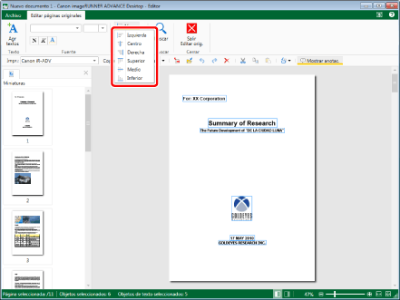 Puede alinear la posición de las imágenes y el texto (objetos) en el Modo de edición de páginas originales de Desktop Editor.