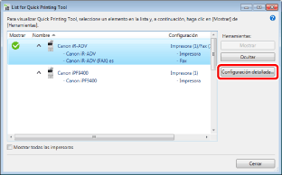 A continuación encontrará más información sobre la visualización de la [Configuración detallada de imageRUNNER ADVANCE Desktop Quick Printing Tool].
