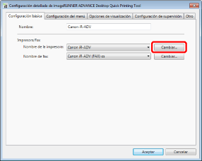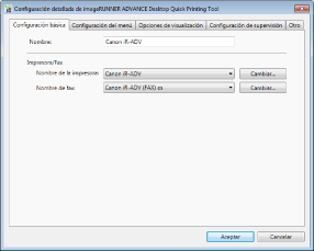 El dispositivo seleccionado en [Nombre de la impresora]/[Nombre de fax] en la pestaña [Configuración básica] de [Configuración detallada de imageRUNNER ADVANCE Desktop Quick Printing Tool] se utiliza para imprimir y enviar faxes.