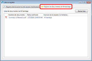 Para guardar el registro en [Registro de documentos de Mi bandeja], seleccione la casilla [Dejar registro de documentos para Mi bandeja] en el menú [Archivo] > [Opción] > [Configuración del sistema] > [Document Monitor] > [Configuración de Mi bandeja].