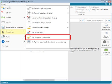 Seleccione el menú [Archivo] > [Herramientas] > [Lista de carpetas monitoreadas].