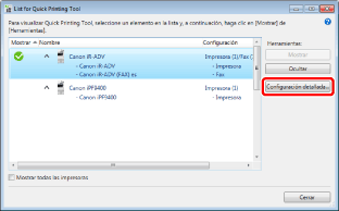 Puede establecer la monitorización del dispositivo en [Configuración detallada de imageRUNNER ADVANCE Desktop Quick Printing Tool] de Quick Printing Tool y hacer clic en [Aceptar] para recuperar automáticamente la información del dispositivo. A continuación encontrará más información sobre [Configuración detallada de imageRUNNER ADVANCE Desktop Quick Printing Tool].
