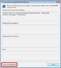 Si desea volver a especificar los ajustes de impresión, es conveniente que copie y pegue el contenido de [Conversión de imageWARE Document File] en un archivo de texto.