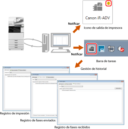 Printer Monitor le permite supervisar el estado de los trabajos de impresión y gestionar los registros de impresión y de recepción/transmisión de fax.