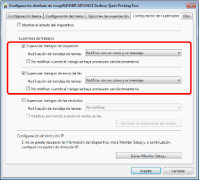 Seleccione los tipos de trabajo para supervisar en la pestaña de [Configuración de supervisión] y seleccione el método de notificación.