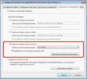 Seleccione la casilla de verificación de [Supervisar trabajos de fax recibidos] en la pestaña [Configuración de supervisión] y seleccione el método de notificación.