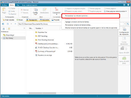 Haga clic con el botón derecho del ratón en la cinta o la barra de herramientas y seleccione [Personalizar la cinta de opciones].