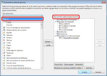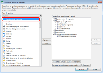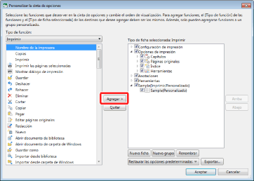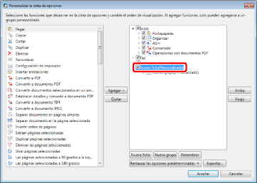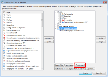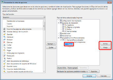 Para cambiar el orden de visualización de las pestañas, los grupos y los comandos añadidos, seleccione la pestaña, el grupo o el comando del que quiera cambiar el orden de visualización en la lista de la derecha y haga clic en [Arriba]/[Abajo].