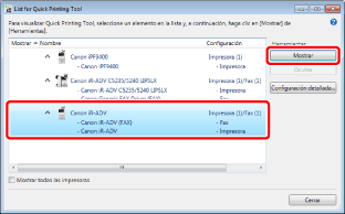 Seleccione el dispositivo donde desea mostrar el Quick Printing Tool de la [List for Quick Printing Tool], y haga clic en [Mostrar].