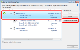Seleccione el dispositivo para el que mostró Quick Printing Tool en [List for Quick Printing Tool] y haga clic en [Configuración detallada].