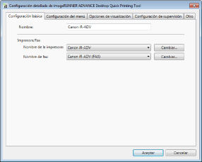 Configure los ajustes detallados para Quick Printing Tool en la pestaña [Configuración básica], en la pestaña [Configuración del menú], en la pestaña [Opciones de visualización] y en la pestaña [Configuración de supervisión].