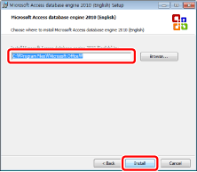 [Install Microsoft Access database engine 2010 (English) to:] 필드에서 설치 폴더를 확인하고 [Install]을 클릭합니다.