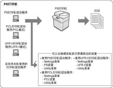 UFR II、PCL、PS和直接打印打印机操作的差异性