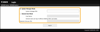 Select [System Manager Mode] or [General User Mode], and then enter the appropriate PIN in [Remote UI Access PIN] as necessary.