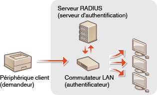 Les informations d'authentification sont envoyées et vérifiées par un serveur RADIUS, qui autorise ou rejette la communication avec le réseau en fonction du résultat de l'authentification. En cas d'échec de l'authentification, un commutateur LAN (ou un point d'accès) bloque l'accès depuis l'extérieur du réseau. L'appareil peut se connecter à un réseau 802.1X en tant que périphérique client.