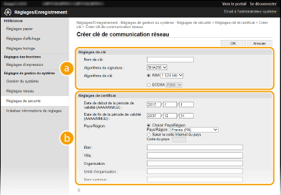 Spécifiez les réglages de la clé et du certificat.