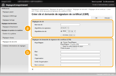 Comme les certificats générés sur l'appareil ne portent pas de signature CA, une erreur de communication peut se produire avec certains périphériques avec lesquels l'appareil communique. Pour qu'une autorité de certification émette le certificat avec une signature CA, vous devez obtenir les données de demande de signature de certificat (CSR), que l'administrateur peut générer depuis l'IU distante. Une fois le certificat émis, enregistrez-le sur la clé générée avec la demande CSR.