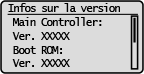 Vérification de la version du microprogrammeVous pouvez vérifier la version du microprogramme depuis le panneau de commande de l'appareil. Une fois la mise à jour du microprogramme effectuée, assurez-vous que celle-ci s'est correctement déroulée. Vérification de la version du microprogramme |