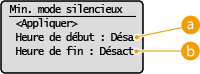 Spécifiez une heure d'activation du mode silencieux. Pour la configuration, sélectionnez <Activé>, puis spécifiez l'heure.
