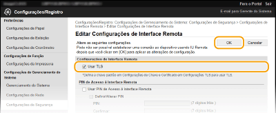 Usando o painel de operaçõesTambém é possível ativar ou desativar a comunicação codificada do TLS no <Menu> da tela Início. <Usar TLS>Iniciando a Interface Remota com o TLSSe você tentar iniciar a Interface Remota quando o TLS estiver ativado, um alerta de segurança sobre o certificado de segurança pode ser exibido. Neste caso, verifique se a URL correta foi digitada no campo de endereço e depois prossiga para exibir a tela da Interface Remota. Iniciando a Interface Remota |