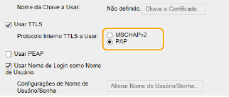 1 | Marque a caixa de seleção [Usar TTLS] ou [Usar PEAP]. Protocolo interno para TTLS É possível selecionar MSCHAPv2 ou PAP. |
