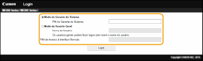 Selecione [Modo do Gerente do Sistema] ou [Modo do Usuário Geral] e digite o PIN adequado em [PIN de Acesso à Interface Remota], conforme necessário.