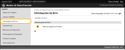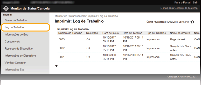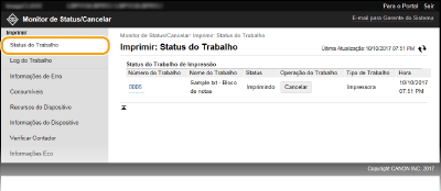 Se entrar no Modo do Gerente do Sistema, todos os documentos a serem impressos e aqueles aguardando impressão são listado. Se você inseriu seu nome de usuário ao fazer logon no Modo do Usuário Geral, seu nome de usuário somente será exibido nos documentos que você imprimiu. Clique em [Número do Trabalho] nos documentos pausados para exibir informações detalhadas. Você pode verificar o nome de usuário e a contagem de páginas do documento impresso. |