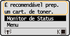 A máquina exibe uma mensagem quando a quantidade restante no cartucho de toner está baixa. Observe que a qualidade da impressão pode ficar comprometida se você continuar a impressão sem resolver esse problema. Você pode verificar a quantidade restante no cartucho de toner no visor (