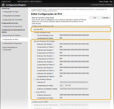Verificando se as definições estão corretasCertifique-se de que a tela de Interface Remota possa ser exibida com o seu computador ao usar o endereço IPv6 da máquina. Iniciando a Interface Remota Seleção de configurações no painel de operaçãoConfigurações IPv6 também podem ser acessadas em <Menu> na tela Início. <Configurações de IPv6> Quando o endereço IP é alterado depois de instalar o driver da impressoraVocê precisa adicionar uma nova porta. Configurando as portas da impressora |
