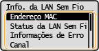 O endereço IP não está configurado corretamente se ele for exibido como "0.0.0.0". Conectar a máquina a um hub de alternação de circuitos ou a uma ponte pode resultar em falha da conexão mesmo quando o endereço IP for configurado de forma correta. Este problema pode ser resolvido através da configuração de um intervalo antes de a máquina iniciar a comunicação. Definição de um tempo de espera para a conexão à rede Você pode imprimir uma lista das definições de rede atuais. Lista de Dados do Usuário |