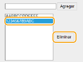 2 | Especifique las direcciones excluidas. Introduzca la dirección MAC en el cuadro de texto [Dirección para guardar] y haga clic en [Agregar]. No tiene por qué delimitar la dirección con guiones ni dos puntos. ![]() Comprobación de los errores de entrada Si las direcciones MAC se introducen de forma incorrecta, es posible que no pueda acceder al equipo desde la IU remota, en cuyo caso deberá establecer <Filtro de direcciones MAC> en <Off>. <Filtro de direcciones MAC> ![]() Eliminación de una dirección MAC de las excepciones Seleccione una dirección MAC y haga clic en [Eliminar]. ![]() |