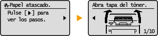 En algunos casos, cuando se produce un error, aparecen instrucciones sobre cómo responder ante dicho error. Siga las instrucciones de la pantalla para solucionar el problema. La pantalla que aparece cuando se produce un atasco de papel se muestra a continuación a modo de ejemplo.